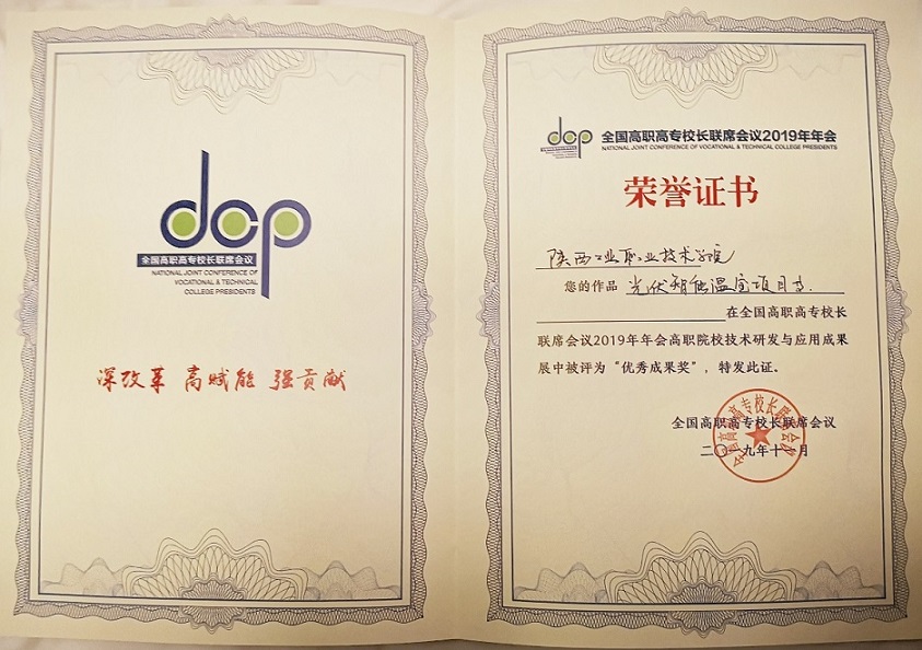 11月22日至23日,以“深改革、高赋能、强贡献”为主题的全国高职高专校长联席会议2019年年会在重庆召开。我院陕西省安康市汉滨区流水镇香山村光伏智能温室科技扶贫项目(陕西省科技厅重点研发计划项目FP2019-023)、典型“非电”锅炉NOx超低排放研究、高纯高均匀3D打印用钛铝合金棒材制备技术、低功耗深度制冷装置四项科技成果参与以“服务企业、便民生活、优化教学、成果转化”为主题的高职院校技术研发与应用成果展。经过与来自全国57所院校共180项科技成果的竞逐,我院“陕西省安康市汉滨区流水镇香山村光伏智能温室科技扶贫项目”等四个项目获得了展会颁发的“优秀成果奖”。