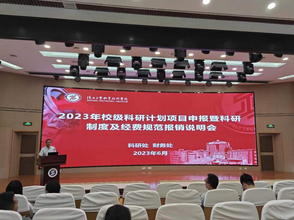 6月15日下午,我校在学术会堂召开了2023年校级科研计划项目申报暨科研制度及经费规范报销说明会,各二级学院科研联络员、拟申报2023年校级项目负责人及项目组成员、各科研平台负责人与科研处人员参加了会议。会议由科研处处长刘引涛主持。